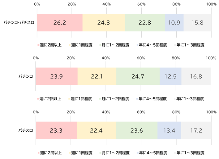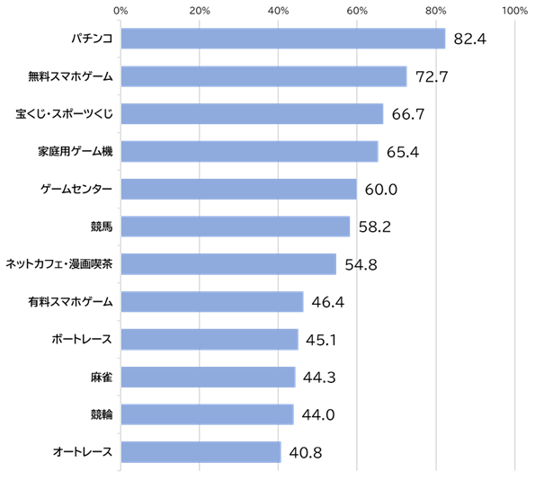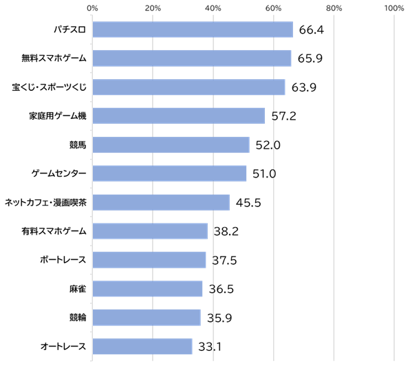 ・パチスロ遊技者は、「パチンコ」「無料スマホゲーム」「宝くじ・スポーツくじ」の順で参加率が高い。
