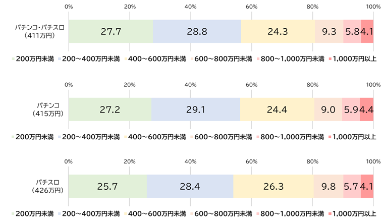 ・パチンコ遊技者の平均年収は415万円、パチスロ遊技者の平均年収は426万円でパチスロ遊技者の方が年収は高い。