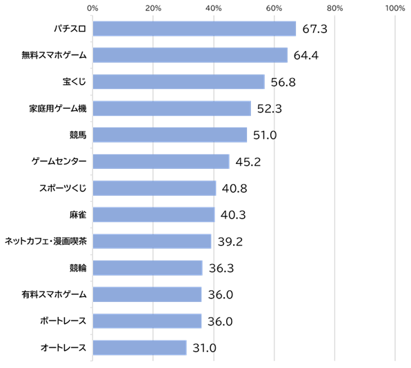 ・パチスロ遊技者は、「パチンコ」「無料スマホゲーム」「宝くじ」の順で参加率が高い。