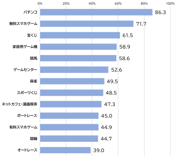 ・パチンコ遊技者は、「パチスロ」「無料スマホゲーム」「宝くじ」の順で参加率が高い。