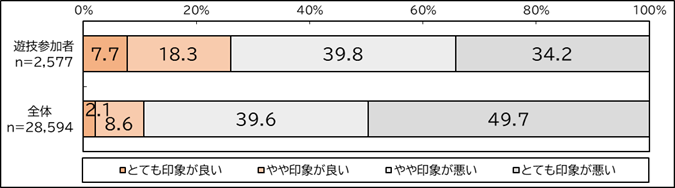 ・パチンコ・パチスロ参加者からみる業界イメージは計74.0%が印象が悪いと感じており、全体(非遊技者含む)では計89.3%が印象が悪いと感じている。