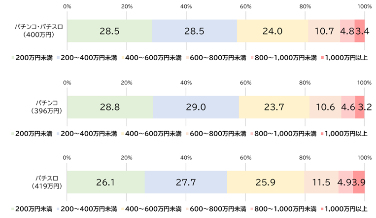 ・パチンコ遊技者の平均年収は396万円、パチスロ遊技者の平均年収は419万円でパチスロ遊技者の方が年収は高い。