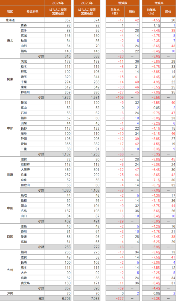 全国遊技場店舗数及び機械台数 全国遊技場店舗数及び機械台数【2024年】 県別営業所数(2024-2023比) 2024年12月31日現在 遊技機設置台数(2024年-2023比) 2024年12月31日現在 (注1) ぱちんこ遊技機と他の遊技機(回胴式遊技機、スマートボール等)を併設している場合は、ぱちんこ遊技機に計上した。 引用:警察庁発表 全日遊連 組合加盟店舗の実態調査【2024】 前の記事 【2025】パチンコ・パチスロ参加者属性/娯楽相関 次の記事