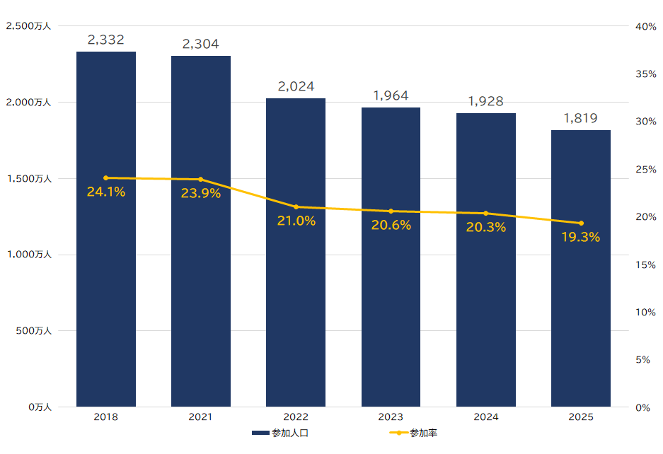 宝くじ 宝くじ 市場動向 参加率と参加人口 宝くじ 宝くじの参加率は19.3%で、参加人口は約1,819万人。 データ元:パチンコ・パチスロプレイヤー調査2025 パチンコ・パチスロプレイヤー調査2025 競馬 市場動向 前の記事 競輪 市場動向 次の記事