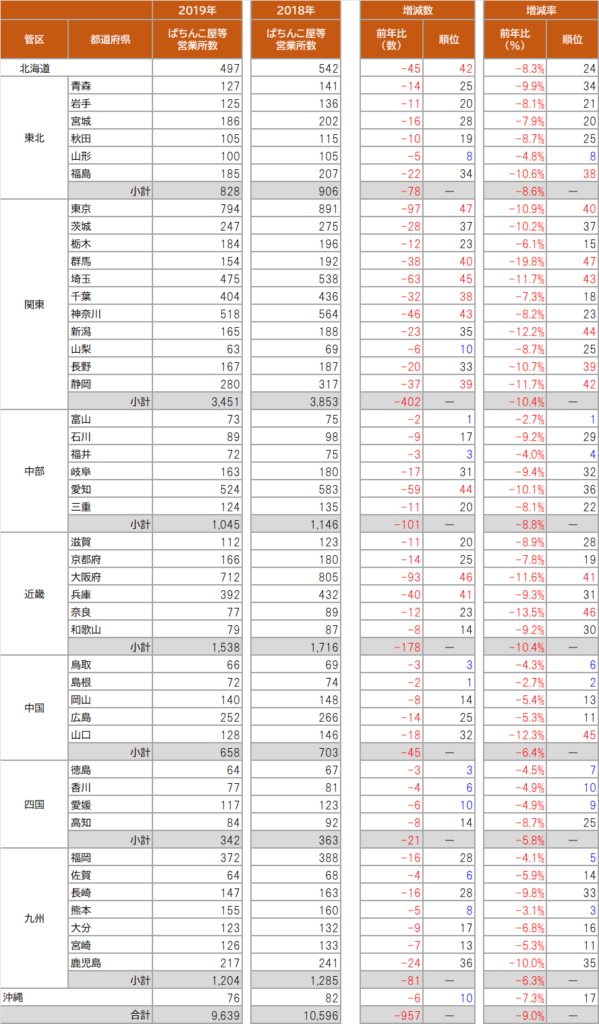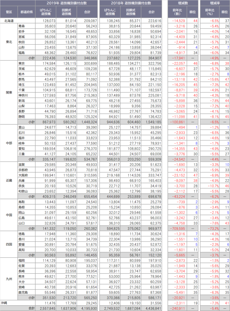 遊技機設置台数(2019年-2018比)