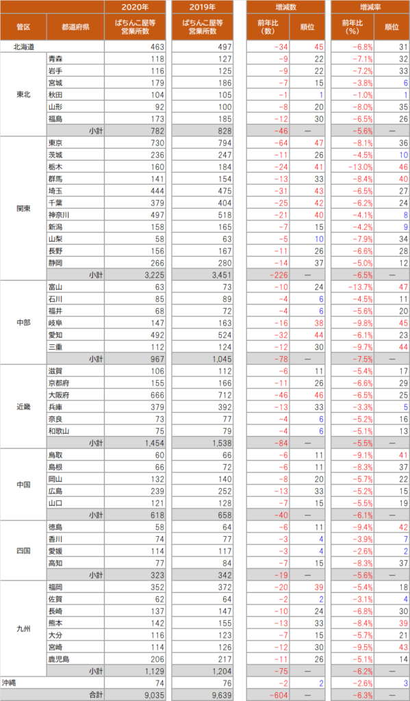 スマートボール等:群馬県(30)、神奈川県(21)、長野県(34)、静岡県(1)、大阪府(53)、和歌山県(37)