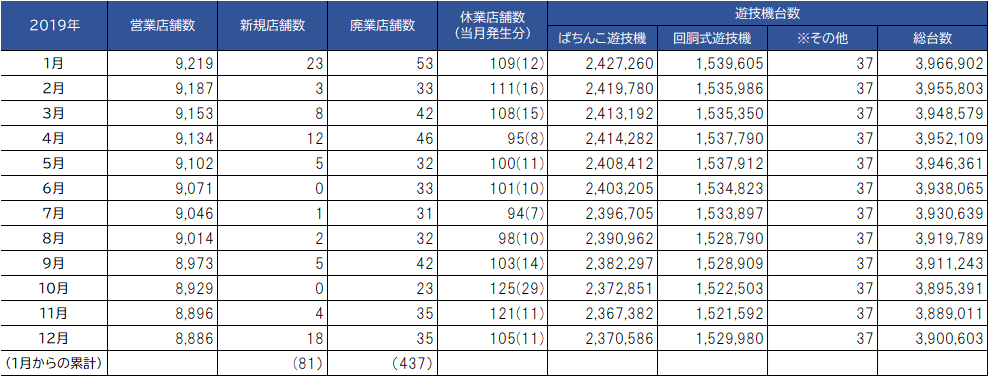④2018年12月 ・営業店舗数9,237・新規店舗数8・廃業店舗数44・休業店舗数122(19)・ぱちんこ遊技機2,422,767・回胴式遊技機1,534,021・その他37・総台数3,956,825